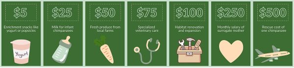 This year’s goal is ambitious: to raise $10,000 to feed and care for the 46 chimpanzees and 3 bonobos entrusted to the sanctuary by the Congolese government.