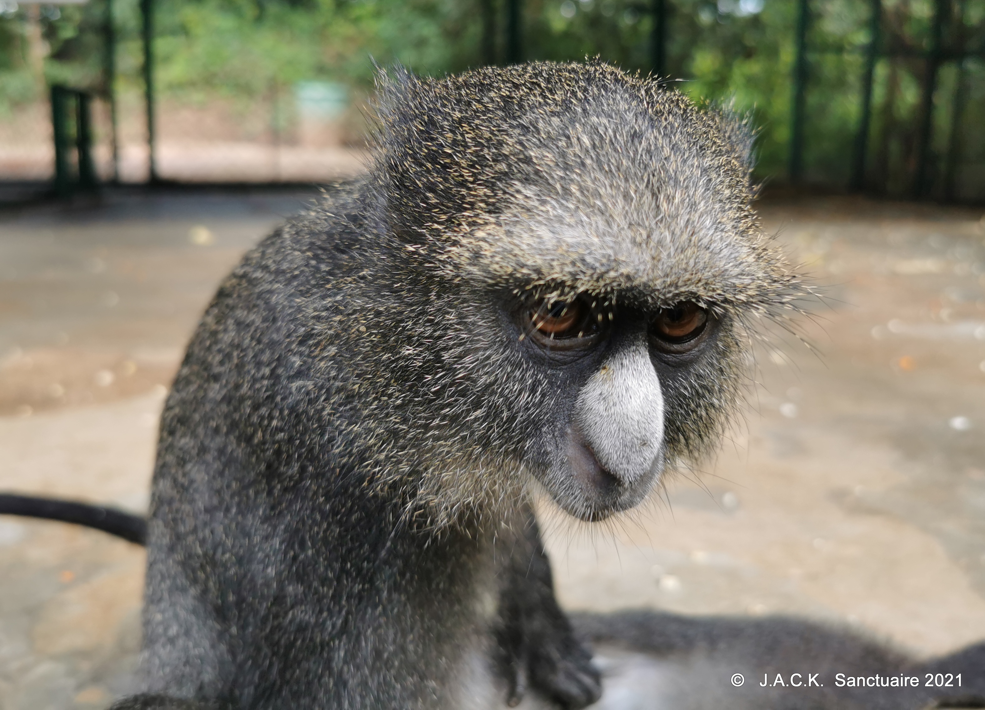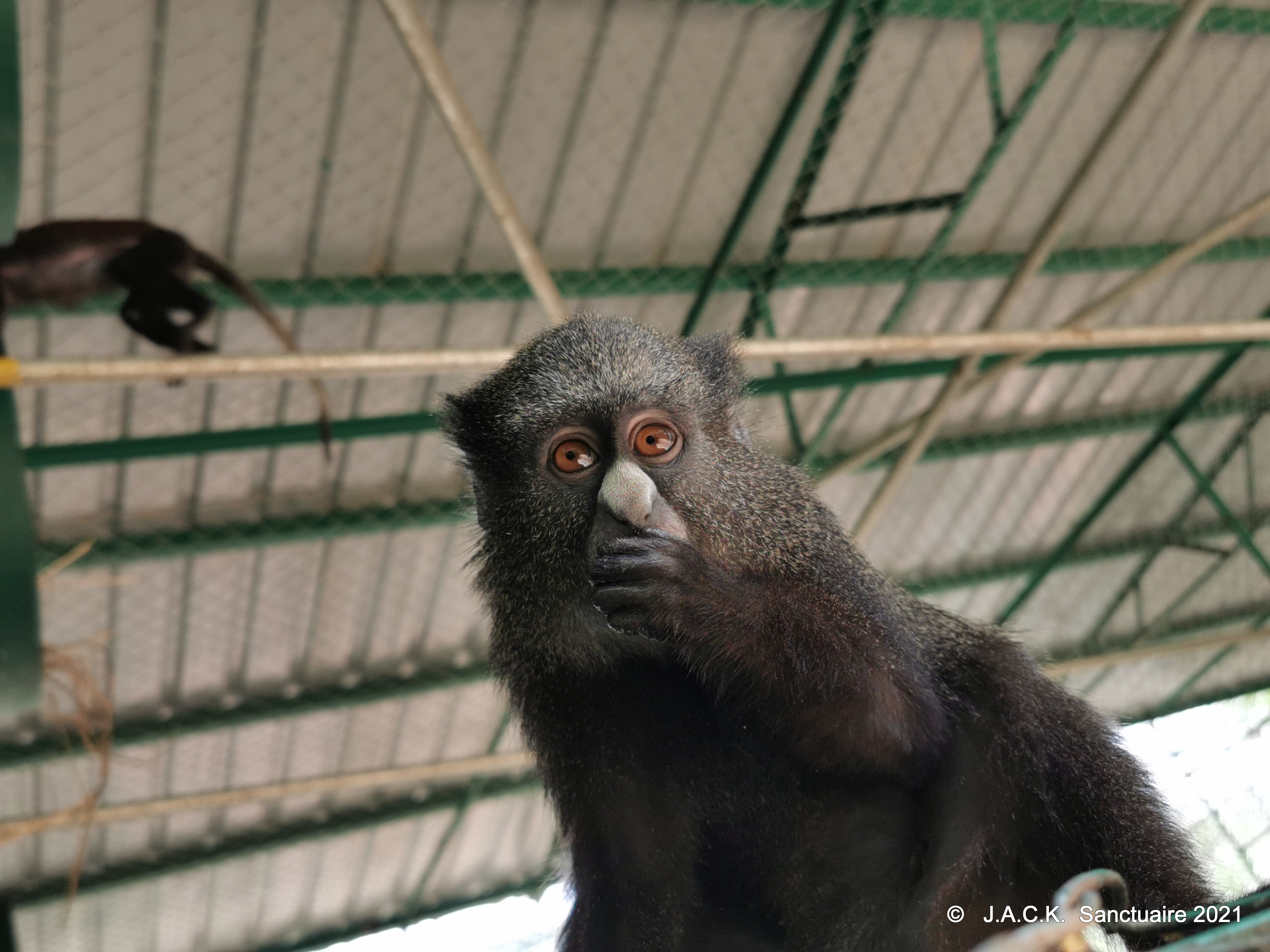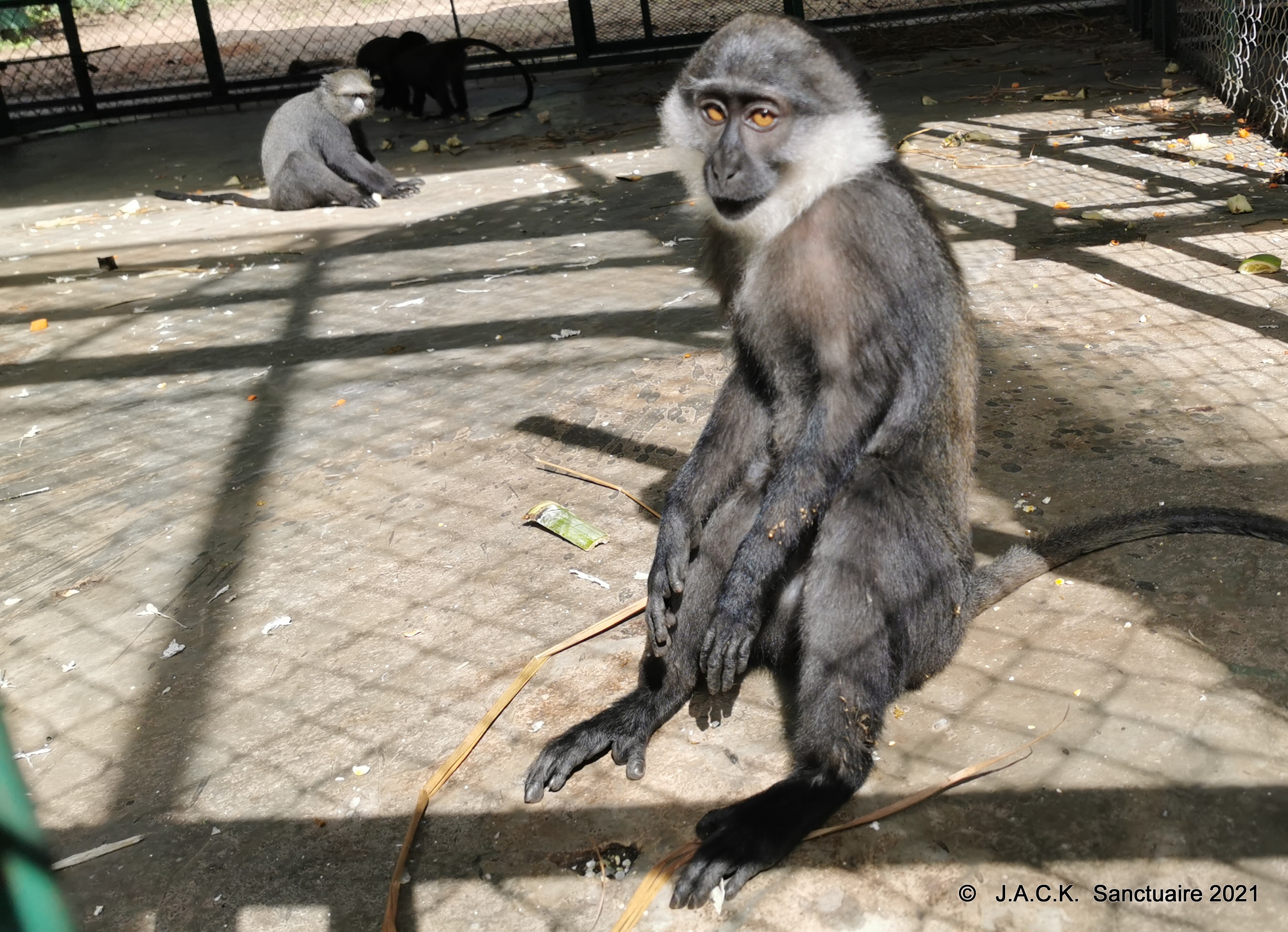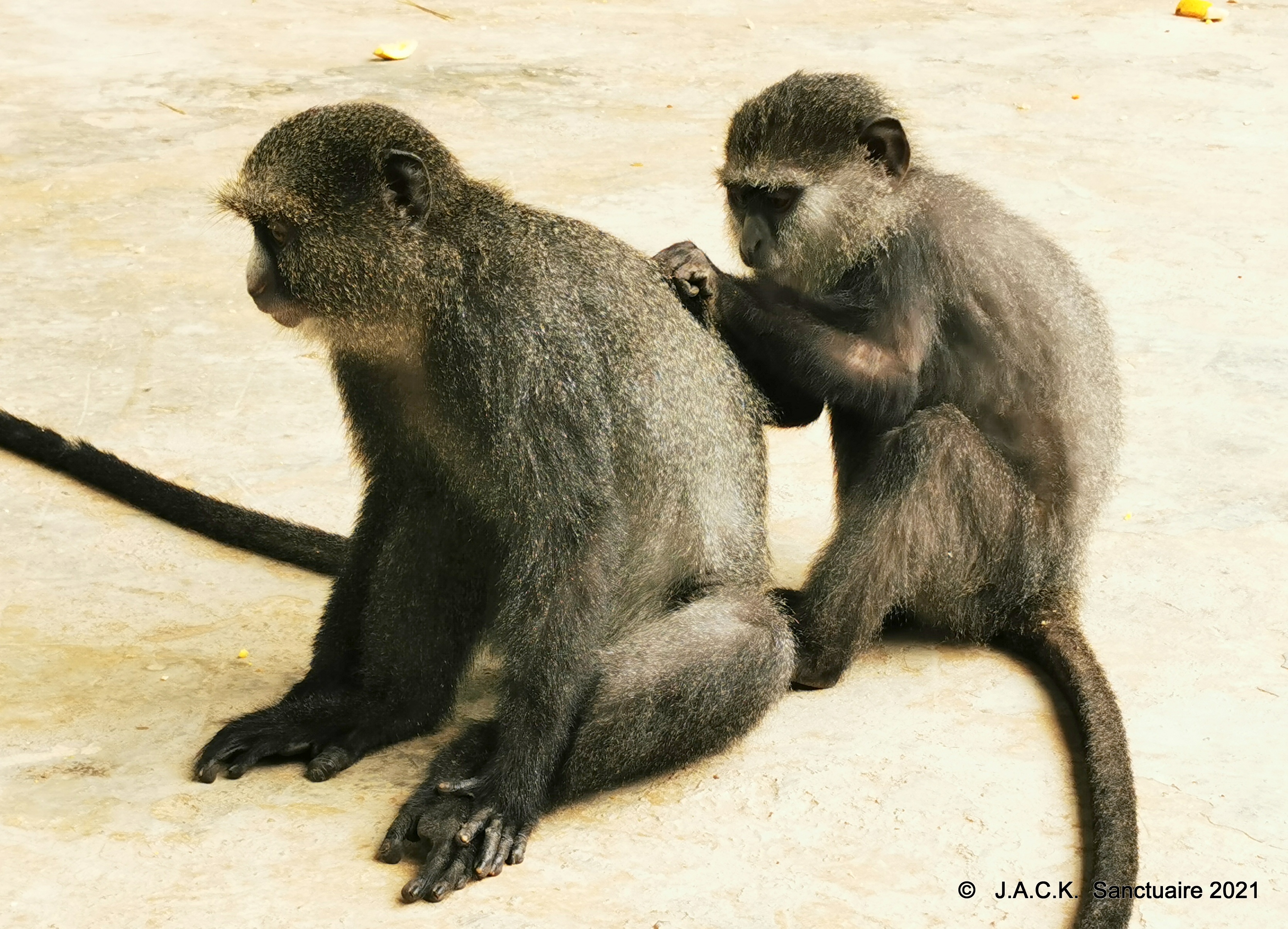The female agile mangabey that had been isolated from the others before arriving at J.A.C.K. (because of her size) is no longer alone! She is sharing her enclosure with another female of the same species. The younger female was very shy at first and afraid of the tall one. Today, they stay in the same nest and do get on well together!